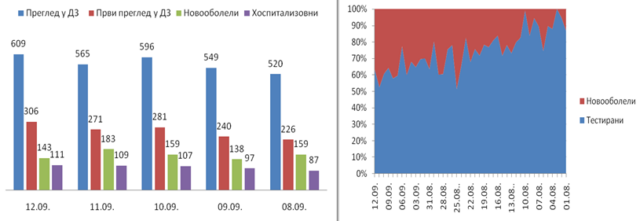 Sl. 1. i 2. U poslednjih 5 dana raste broj svih pregleda u COVID ambulanti Doma zdravlja od 520 do 609, prvih pregleda od 226 do 306, novoobolelih od 138 do 183, hospitalizovanih od 87 do 111. Raste procenat pozitivnih od 01.08. od 10% do danas oko 50%.