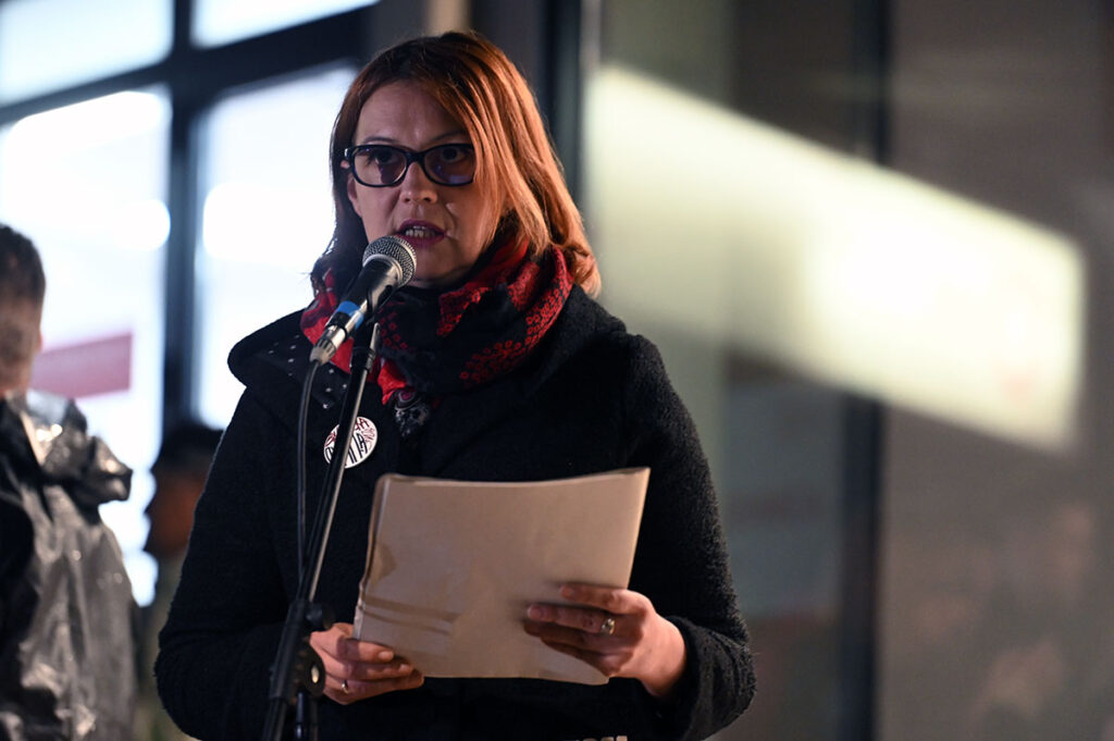 “Pripadam onim kolektivima koji su u obustavi nastave, konkretno Valjevskoj gimnaziji koja je da podsetim u neprekidnoj obustavi nastave od 17.decembra prošle godine, kao i Osnovnoj školi Milovan Glišić čiji je manji deo kolektiva u neprekidnoj obustavi od prve polovine februara ove godine. Kada kažem manji deo kolektiva, u pitanju je osam do deset ljudi, tačnije do prošle nedelje nas je bilo 10, ove nedelje nas je osam. Mnogo sam srećna što radim sa borbenim, dostojanstvenim ljudima koji žrtvuju svoju egzistenciju zarad onoga što smatraju da je mnogo važnije, a to su obraz i borba za ono u šta veruju. Hrabre kolege i koleginice iz Muzičke škole “Živorad Grbić” i iz Medicinske škole su takođe u neprekidnoj obustavi nastave od kraja januara ove godine, i verovatno najhrabrija među nama, jedna koleginica iz Poljoprivredne škole sa domom učenika koja je mesecima sama u obustavi. Ne smem da zaboravim i tri hrabre koleginice iz Osnovne škole u Mionici koje su u neprekidnoj obustavi od kraja januara meseca. Sve do ove nedelje u neprekidnoj obustavi koja je trajala više od četiri nedelje su bili delovi kolektiva Tehničke i Ekonomske škole u Valjevu, kao i dve koleginice iz Osnovne škole Dragoljub Ilić u Dračiću. Oprostite mi ako sam zaboravila nekoga da spomenem. Obustava nastave nije samo čin protesta. Ona je naš vapaj, naš znak upozorenja da više ne možemo ćutati. Naše društvo je u teškoj situaciji, mnogi ljudi teško sastavljaju kraj sa krajem, a među njima smo i mi prosvetni radnici koji opstajemo u ovoj profesiji zahvaljujući entuzijazmu i ljubavi prema pozivu koji smo odabrali. Godinama unazad naša profesija je i sistemski i sistematski degradirana. Do te mere da mladi ljudi ne žele da upisuju profesorske smerove na fakultetima, a i ako ih završe svakako ne žele da se bave ovim poslom što polako ali sigurno vode ka tome da buduće generacije neće imati ko da uči. Kao društvo smo dovedeni do apatije i beznađa, do osećaja nemoći, što rezultira egzodusom mladih koji više ne vide budućnost u svojoj zemlji. U tom mraku pojavila se svetlost, generacija mladih ljudi, naši učenici i studenti. Oni su postali snaga koja pokreće talas nade. Svojim otpimizmom i borbom za pravednije društvo pokazali smo im put i mi smo im se pridružili. Ti mladi ljudi su upalili vatru nade kojom su obasjali Srbiju pa je ona odjednom postala vidljiva u celom svetu. Uloge su se promenile, naši učenici su sada učitelji. Učitelji solidarnosti, kulture, rodoljublja, učitelji poštenja i odgovornosti. Oni ne odustaju, a ni mi ne smemo. Naša dužnost je da im pomognemo da postanu ljudi. Na ovom mestu moram da istaknem valjevske učenike, našu valjevsku mladost čija je angažovanost, posvećenost, empatija i zajedništvo kod nas prosvetnih radnika izazvala ogromnu radost. I mi smo stali uz svoje đake. Tu smo da ih štitimo i pomognemo, da znaju da u nama imaju veliki oslonac”.